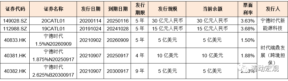 (2)截至2021年9月底,寧德時代共有5只存量債券,債券余額為175.28億元(凈增31.46億元)。具體看,這5只債券主要包括兩只境內(nèi)債(合計45億元人民幣)和3只美元債(合計20億美元),其中美元債主要由寧德時代借助在香港的全資子公司時代瑞鼎發(fā)展以跨境擔(dān)保的形式發(fā)行。