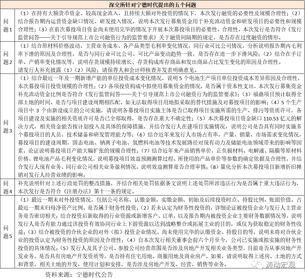 2、整體上看,深交所提出了五個問題,并要求保薦人、會計師、律所等中介機(jī)構(gòu)出具審核意見,其根本問題是質(zhì)疑寧德時代可能存在過度融資,即在持有大額貨幣資金、較高現(xiàn)金流入,且持續(xù)大額對外投資的情況下,此次定增的必要性及規(guī)模合理性需要進(jìn)行說明等。