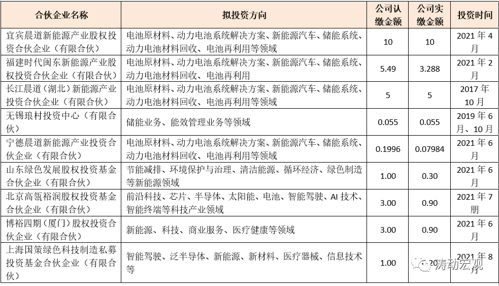 2、此外,2021年10月11日,寧德時代發(fā)布公告稱,通過受讓以及參與新設(shè)的方式投資珠海隱山現(xiàn)代物流產(chǎn)業(yè)股權(quán)投資基金(有限合伙)、青島隱山創(chuàng)業(yè)投資基金合伙企業(yè)(有限合伙)以及廈門隱山股權(quán)投資合伙企業(yè)(有限合伙),認(rèn)繳金額分別為0.60億元、2億元及3億元。