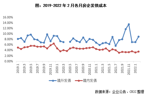 2022年2月100家典型房企新增債券類融資成本4.02%,環(huán)比下降0.89pct,同比下降0.87pct。其中境內(nèi)融資成本3.58%,環(huán)比上升0.37pct;境外融資成本9.05%,環(huán)比上升3.02pct,主要由于境外債券僅發(fā)行了兩筆,其中銀城國際發(fā)行的1.65億元境外優(yōu)先票據(jù)成本達(dá)到13.00%,從而拉高了融資成本。2021年截至2月100家典型房企新增債券類融資成本4.61%,較2021年下降0.68個(gè)百分點(diǎn),其中境外債券融資成本達(dá)7.16%,上升0.14個(gè)百分點(diǎn),境內(nèi)債券融資成本3.39%,較2021年下降0.67個(gè)百分點(diǎn)。