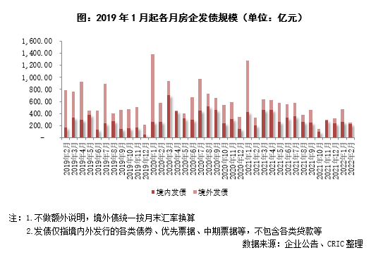 2月房企共發(fā)債248.47億元,環(huán)比下降47.6%,同比下降24.6%。其中,境外發(fā)債19.87億元,環(huán)比下降90.7%,同比下降84.3%,本月只有綠城完成了1.5億美元優(yōu)先票據(jù)的發(fā)行以及銀城國際完成了一筆債券的交換要約,房企境外發(fā)債情況仍較為嚴(yán)峻。境內(nèi)發(fā)債228.60億元,環(huán)比下降12.3%,同比上升12.8%,其中,公司債發(fā)行63億元,環(huán)比下降7.4%,同比上升39.4%;中期票據(jù)發(fā)行148.40億元,環(huán)比上升30.3%,同比上升642.0%;融資券發(fā)行17.2億元,環(huán)比下降78.2%,同比下降75.1%,在政策支持優(yōu)質(zhì)房企發(fā)行并購中票、住房租賃債券的情況下,房企的公司債、中期票據(jù)發(fā)行量有所上漲,同時(shí)短債發(fā)行量有所降低。