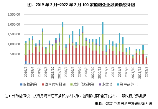 2022年2月100家典型房企的融資總量為398.17億元,環(huán)比下降58.9%,同比下降58.8%,融資量創(chuàng)2018年1月以來新低。一方面2月春節(jié)假期工作日相對(duì)較少,融資可操作時(shí)間相對(duì)較短;另一方面近期仍持續(xù)爆發(fā)企業(yè)債務(wù)危機(jī),當(dāng)前風(fēng)險(xiǎn)出清尚未完全,企業(yè)投資及發(fā)債也較為謹(jǐn)慎。從融資結(jié)構(gòu)來看,境內(nèi)債權(quán)融資318.63億元,環(huán)比下降34.0%,同比下降29.7%;境外債權(quán)融資52.33億元,環(huán)比下降75.9%,同比下降68.9%;本月資產(chǎn)證券化下降較為明顯,融資26.21億元,環(huán)比下降88.6%,同比下降91.6%。