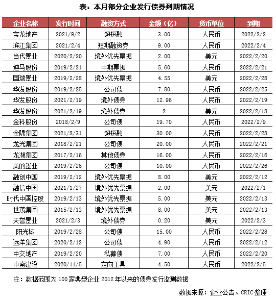 本月房企有22筆債券到期,金額共計(jì)376.20億元,環(huán)比下降36.7%,到期債券只數(shù)環(huán)比減少17只。值得注意的是,本月有銀城國際就企業(yè)存續(xù)期境外債完成了部分債券的交換要約,相當(dāng)于2022年2月到期的債券到期時(shí)間已經(jīng)成功延期,新票據(jù)期限為364天。