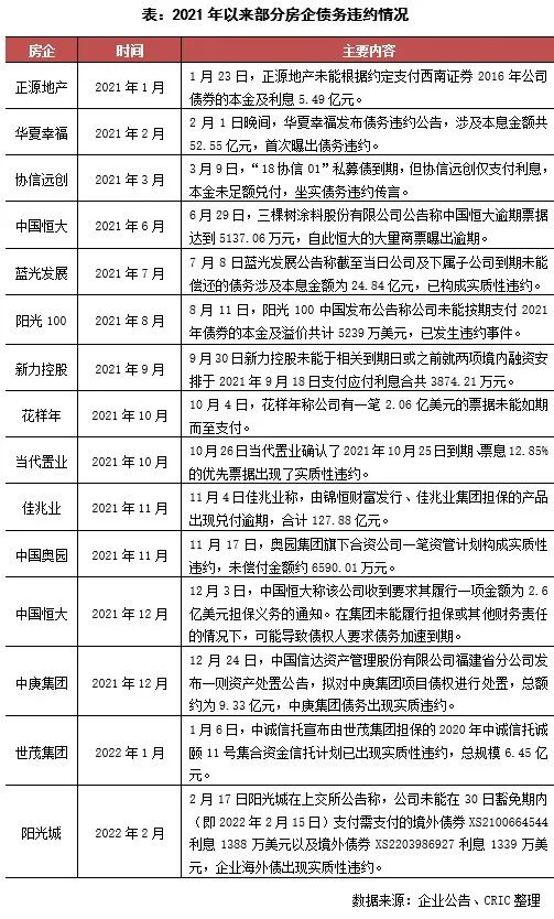 在債務(wù)違約方面,2月18日陽光城發(fā)布公告稱企業(yè)未能在 30 日豁免期內(nèi)(即 2022 年 2 月 15 日)支付境外債券利息共2726.25萬美元,企業(yè)海外債發(fā)生了實(shí)質(zhì)性違約。再加上佳源等企業(yè)被曝出出現(xiàn)了流動(dòng)性問題,房企的流動(dòng)性危機(jī)仍在持續(xù),未來仍有可能曝出更多的債務(wù)違約事件。