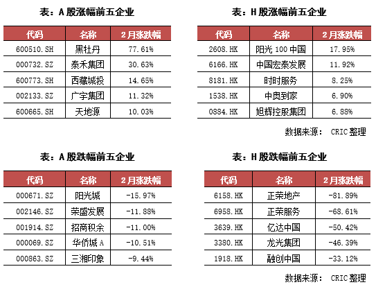 本月兩市的地產(chǎn)相關(guān)股表現(xiàn)都較為一般,A股地產(chǎn)股整月上漲的股票占比為了57%,而H股整月上漲的股票占比則僅為35%,同時(shí)大多數(shù)股票整月漲幅基本都低于10%。在H股方面,本月陽光100的月漲幅達(dá)到了17.95%,是H股漲幅最大的地產(chǎn)相關(guān)股。不過企業(yè)由于去年8月份曝出債務(wù)違約的原因,股價(jià)長期低迷,2月份甚至長期停牌,只是由于在2月11日大漲了18.75%使得公司股票整月漲幅達(dá)到了地產(chǎn)相關(guān)股的第一,企業(yè)本身的發(fā)展仍然需要觀察。