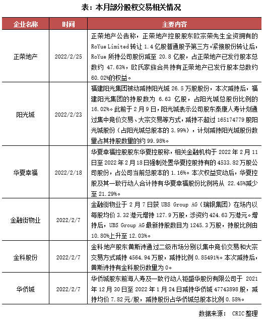 本月房企及房企旗下公司的股權(quán)變動(dòng)較少,僅有正榮、陽光城、華夏幸福、金科等企業(yè)出現(xiàn)了規(guī)模較小的股東股權(quán)變動(dòng),其中陽光城和華夏幸福都出現(xiàn)了控股股東的被動(dòng)減持。整體看來,本月出現(xiàn)股權(quán)變動(dòng)的企業(yè)有部分原因是因?yàn)槠髽I(yè)流動(dòng)性問題,未來這些企業(yè)的經(jīng)營以及自救都有待觀察。