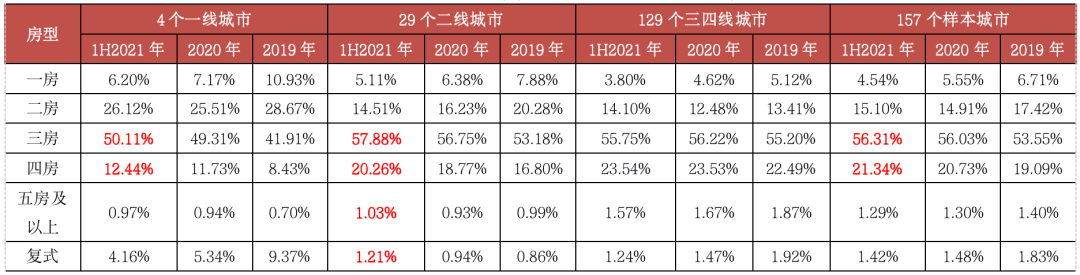 一線城市三房、四房占比持續提升。2021年上半年,一線城市三房戶型成交占比50.11%,較2020年再增0.8個PTS;四房成交占比12.44%,較2020年再增0.71個PTS。