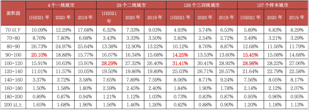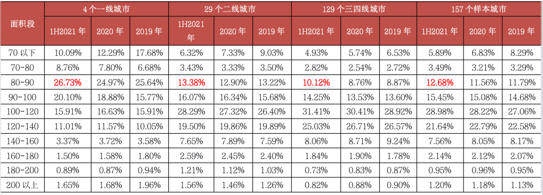 表:157個重點監測城市普通住宅分面積段成交套數占比