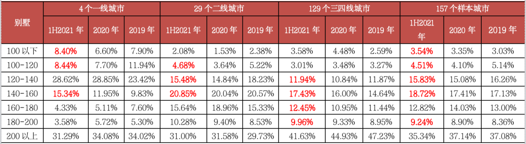 表:157個重點監測城市別墅分戶型成交套數占比