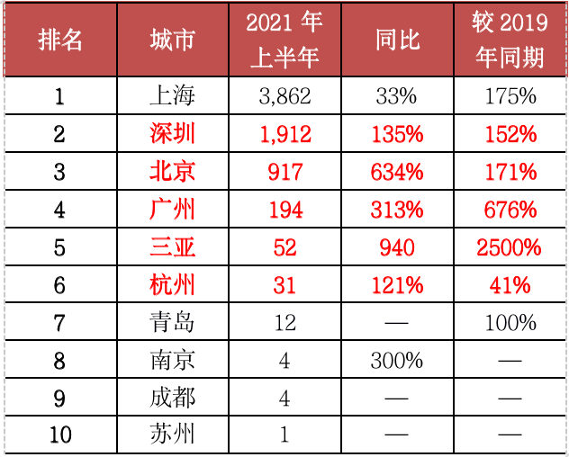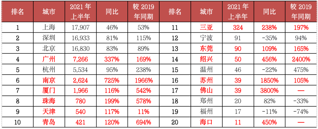 表:2021年上半年單價10萬元/平方米以上豪宅成交套數TOP20城市(單位:套)