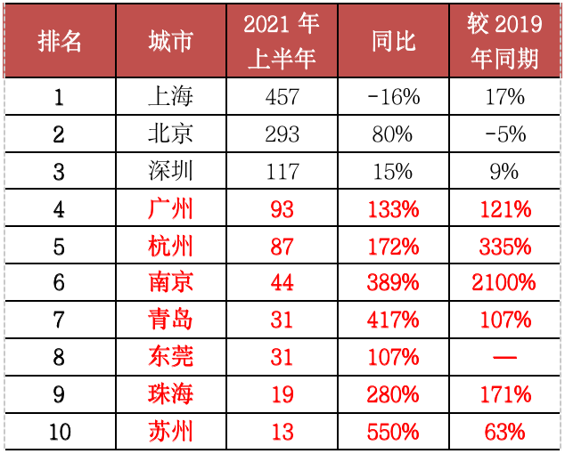 廣州、杭州、南京等多城頂豪市場轉暖,2021年上半年總價3000萬元以上頂豪成交明顯放量,同比均實現翻倍增長。
