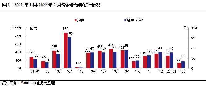 2022年2月企業債券發行21只,發行規模136.67億元,較上月分別下降55%和57%,較上年同期分別增長17%和下降22%。本月受春節影響,發行規模有所下降。