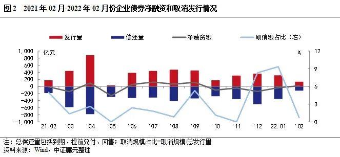 市場概況:(1)2月企業債發行21只,發行規模136.67億元,同比分別增長17%和下降22%,環比分別下降55%和57%。(2)2月凈融資為18億元,上年同期為凈償還9億元。2月,1只企業債取消發行,原計劃發行規模1億元。從地區分布看,2022年2月份多省企業債凈融資以凈償還為主。