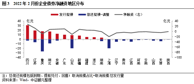 從地區分布看,2022年2月份多省企業債凈融資以凈償還為主。具體看,四川實現凈發行28億元、遠高于其他省份,其次是江蘇和廣東,凈融資規模分別為13億元和10億元。重慶因償還規模較大,當月凈融資規模-9億元。此外,陜西、遼寧等9個省份本月未發行企業債,以償還為主,其中上海償還規模最大,為20億元。