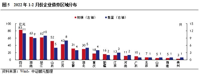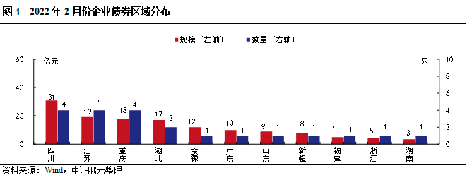 2022年2月,共有11個省份發行了企業債券。其中,四川發行30.90億元,規模高于其他省份,其次,江蘇和重慶分別發行19.20和17.60億元。與上年同期相比,有7個省份發行規模出現增長,其中,江蘇、重慶和湖北,漲幅相對較大。有4個省份發行規模同比下降。