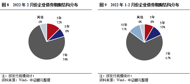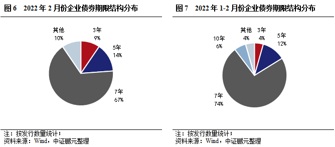 2022年2月,企業債券期限分布于7年期等期限品種。其中,7年期品種發行14只,占比67%,發行規模100.50億元,占比74%;5年期品種發行3只,占比14.3%,發行規模10.70億元,占比7.8%。與上月相比,5年期和7年期品種發行規模占比較上月分別下降3和上升9個百分點。綜合2022年1-2月看,7年期品種發行數量和規模分別為50只,303.80億元,占比分別為74%和67%。與上年同期相比,7年期品種規模占比上升10個百分點。