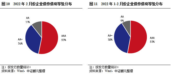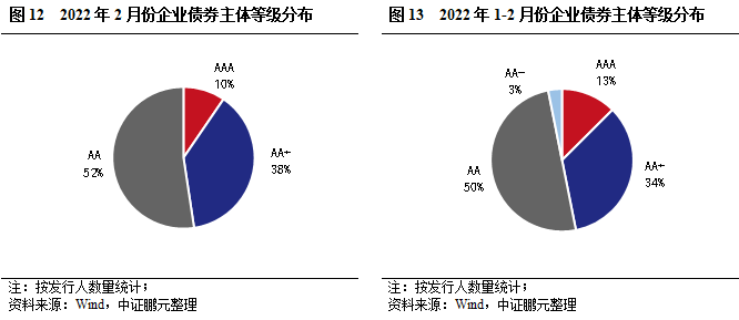 從發行主體等級看,2月AAA級主體2家,占比10%;AA+級主體8家,占比38%;AA級主體11家,占比52%,AA+及以上的高級別主體占比89%,較上月下降1個百分點。綜合2022年1-2月份看,AA+及以上的高級別主體占比46.9%,較上年同期上升1個百分點。