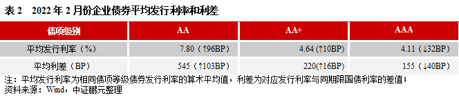 2022年2月,企業債券最高發行利率為7.80%,較上月下行20BP;最低發行利率為2.70%,較上月下行24BP。從債券級別來看,與上月相比,AA級和AA+級企業債平均發行利均上行,發行利差均擴大,其中AA級利率上行96BP,利差擴大103BP,幅度最大;AAA級企業債平均發行利率下行32BP,利差收窄40BP。