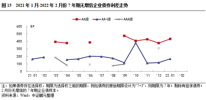 2022年2月,企業債有擔保的債券共計12只,數量占比57%,較上月上升8個百分點,主要是AA+級主體增信比例上升,企業債增信比例持續上升。分主體級別看,AA級主體選擇增信發行的債券比重為82%,較上月上升9個百分點;AA+級主體選擇增信發行的債券比重為25%,與上月持平。本月無AA-級主體發行。綜合2022年1-2月看,有擔保債券共計34只,數量占比51%,較上年同期上升4.8個百分點。