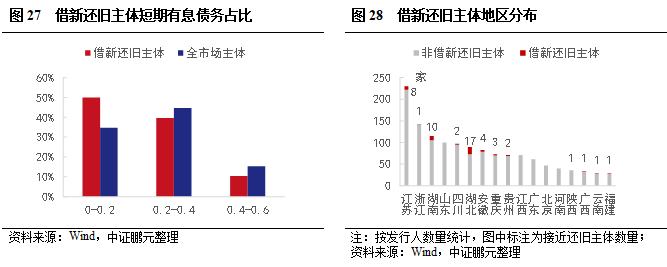 和全市場企業債相比,借新還舊企業債主體資產負債率偏高,現金短債比和短期債務占比表現相對較好,但短期償債能力依然較弱。從地區看,存量主體較高的江浙地區借新還舊較少,湖北和湖南相對較多,借新還舊主體省內占比分別為19%和9%。