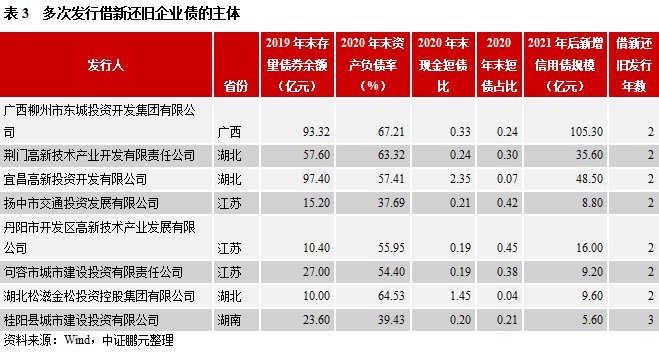 整體看,借新還舊企業債主體的高負債率占比較高,后續再融資分化明顯,存續債券較多的發行人再融資較為活躍,存續債券較少的發行人再融資規模較小,尤其是存續債券僅為企業債的主體,后續再融資以企業債為主,用于借新還舊。