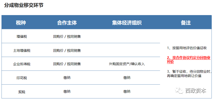 開發商按照相關協議將建成物業以無償移交的方式給到村集體和村民的情形下,開發商需就分成物業按視同銷售繳納增值稅、土地增值稅及企業所得稅等,計稅依據按照留用地轉讓時點分成物業的約定價值(或市場評估價值)。村集體和村民主要繳納契稅、印花稅,其中村集體還需繳納企業所得稅,根據《國家稅務總局關于印發〈房地產開發經營業務企業所得稅處理辦法〉的通知》(國稅發〔2009〕31號)第三十七條規定:以換取開發產品為目的,將土地使用權投資其他企業房地產開發項目的,應在首次取得開發產品時,將其分解為轉讓土地使用權和購入開發產品兩項經濟業務進行所得稅處理,并按應從該項目取得的開發產品(包括首次取得的和以后應取得的)的市場公允價值計算確認土地使用權轉讓所得或損失。另根據《中華人民共和國企業所得稅法實施條例》第五十八條規定,非貨幣性資產交換取得的固定資產,以該資產的公允價值和支付的相關稅費為計稅基礎。開發商和村集體確認的資產公允價值應保持一致。
