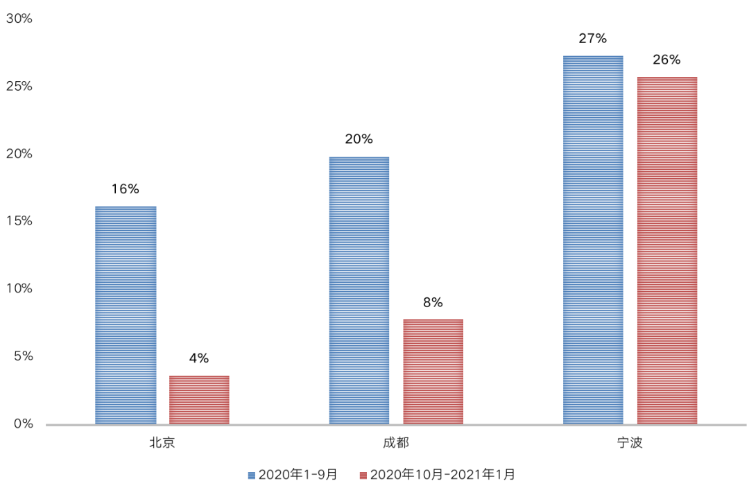 圖:2020年10月前后北京、成都、寧波成交宅地溢價率對比