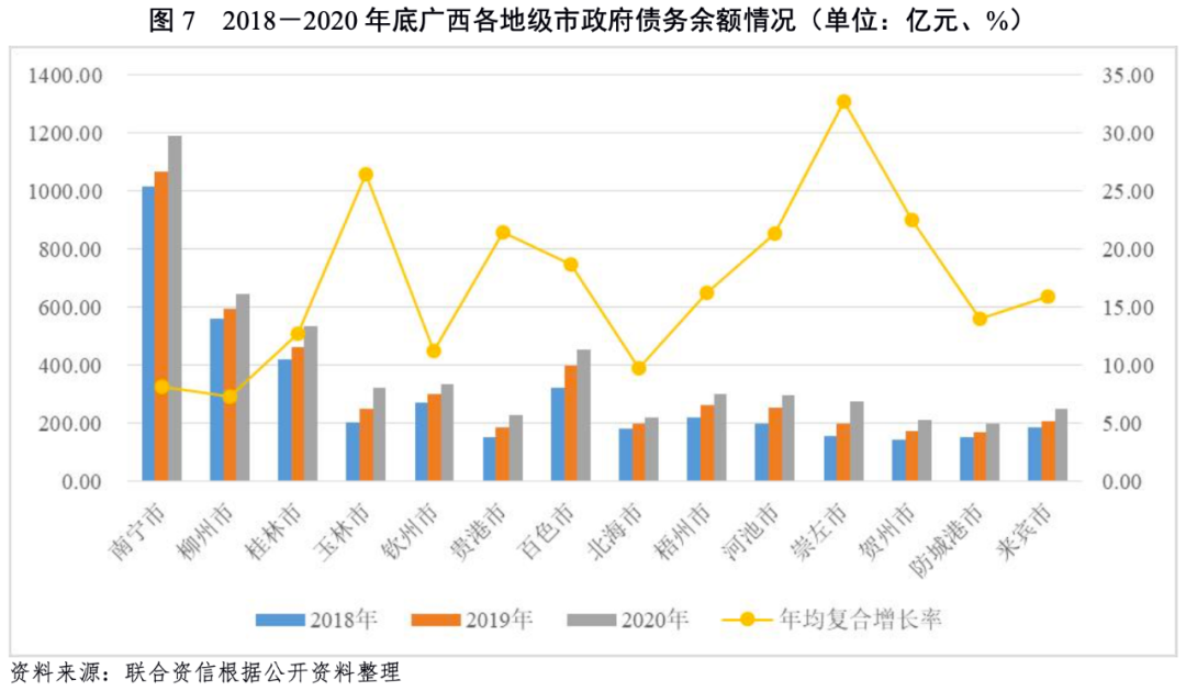 從債務(wù)層面看,廣西各地級(jí)市中,南寧市政府債務(wù)規(guī)模最大,為1189.94億元;隨后是柳州市、桂林市、百色市、欽州市和玉林市,以上5個(gè)地級(jí)市政府債務(wù)余額均在300~700億元之間。2018-2020年底,廣西各地級(jí)市政府債務(wù)余額均呈上升趨勢(shì),其中崇左市政府債務(wù)余額增長(zhǎng)最快,年均復(fù)合增長(zhǎng)率達(dá)32.78%,玉林市、賀州市、貴港市和河池市政府債務(wù)余額年均復(fù)合增長(zhǎng)率達(dá)到20.00%以上。