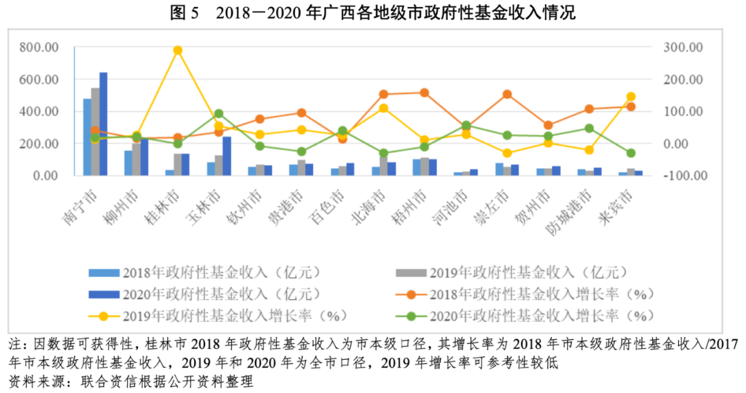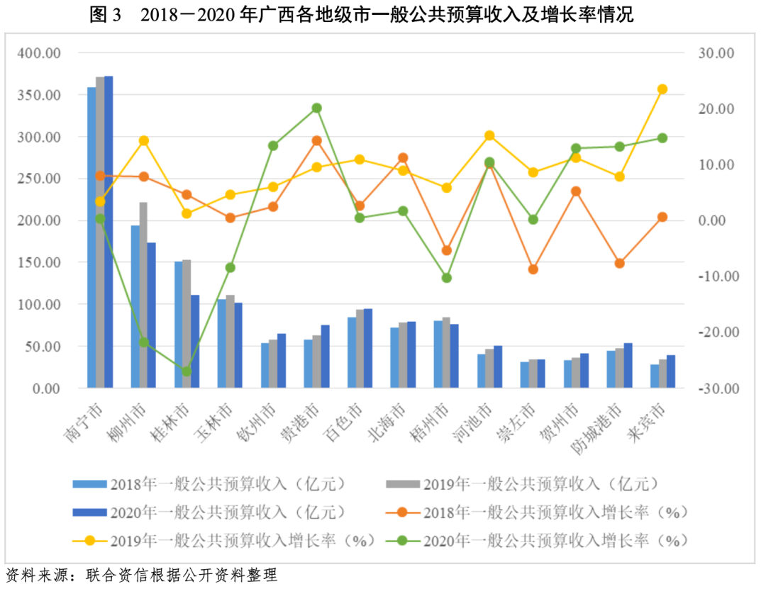 廣西各地級(jí)市中南寧市的一般預(yù)算收入和基金收入規(guī)模遠(yuǎn)高于其他地級(jí)市,賀州市、來(lái)賓市和崇左市一般預(yù)算收入規(guī)模較小;廣西大部分地級(jí)市一般公共預(yù)算收入的穩(wěn)定性一般,財(cái)政自給能力偏弱。廣西各地級(jí)市政府債務(wù)余額呈上升趨勢(shì),崇左市債務(wù)余額增速最快。2020年,廣西各地級(jí)市政府負(fù)債率均有所提升,但整體債務(wù)負(fù)擔(dān)相對(duì)較輕;欽州市、來(lái)賓市和防城港市政府債務(wù)率較高,償債壓力較大。