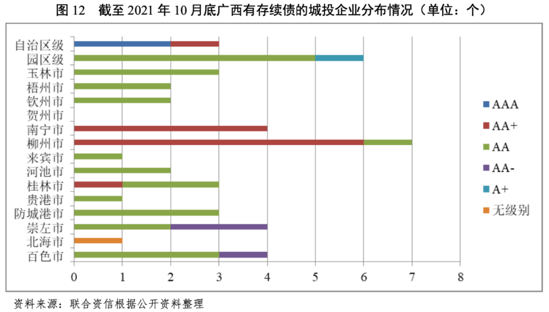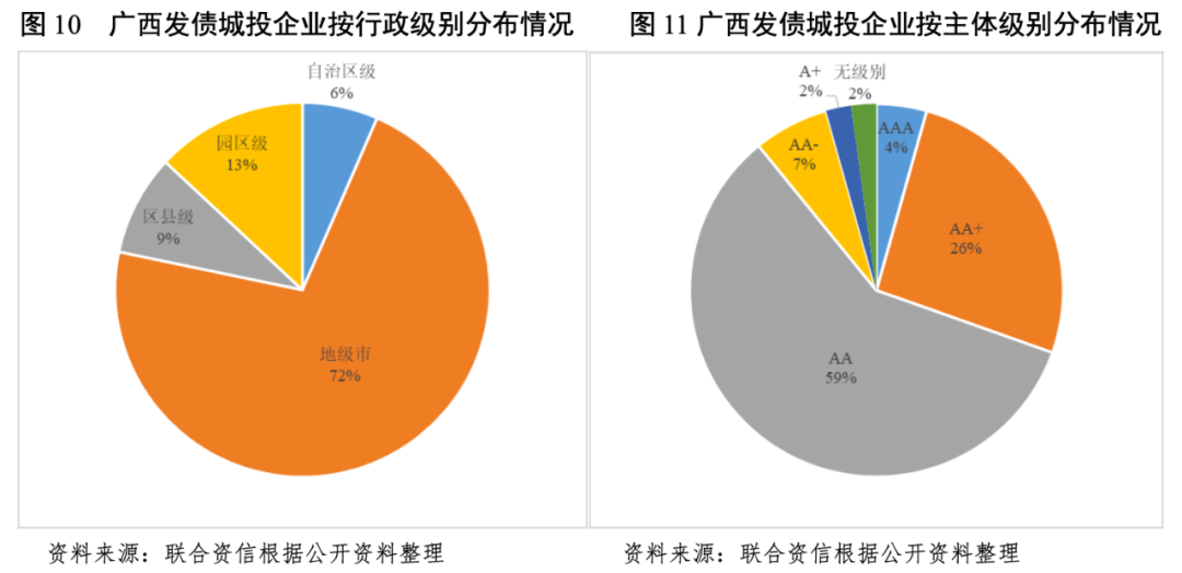廣西發(fā)債城投企業(yè)主要為地級(jí)市城投企業(yè),區(qū)縣城投企業(yè)較少,柳州市為廣西發(fā)行城投債最多的地區(qū)。廣西發(fā)債城投企業(yè)的信用等級(jí)普遍集中在AA級(jí)別。