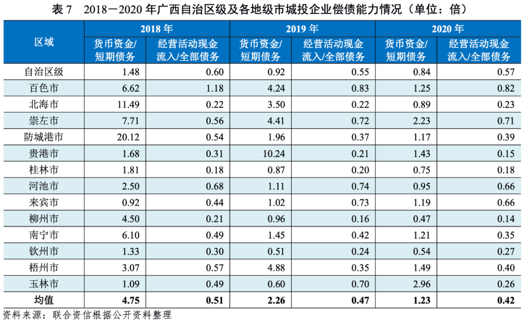 城投企業(yè)的經(jīng)營(yíng)活動(dòng)現(xiàn)金流入主要包括業(yè)務(wù)回款、政府往來(lái)款等。2018-2020年,廣西自治區(qū)級(jí)及各地市城投企業(yè)經(jīng)營(yíng)活動(dòng)現(xiàn)金流入/全部債務(wù)均值分別為0.51倍、0.47倍和0.42倍,逐年下降。截至2020年底,北海市、貴港市、桂林市、柳州市、欽州市和玉林市城投企業(yè)經(jīng)營(yíng)活動(dòng)現(xiàn)金流入對(duì)全部債務(wù)的覆蓋程度很低,不足0.30倍。