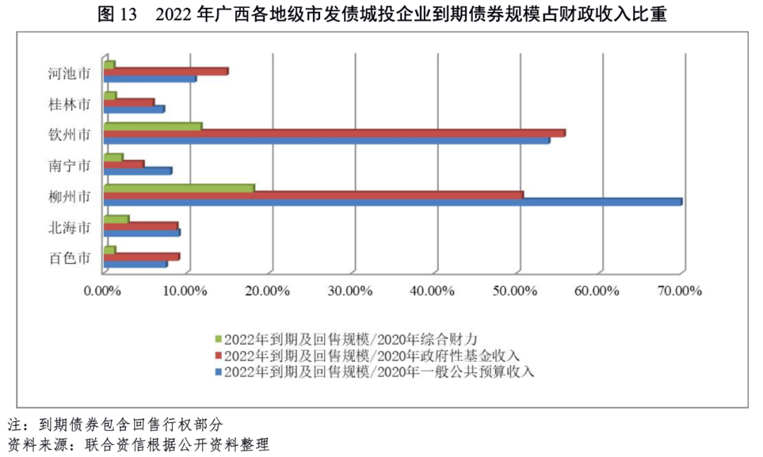 以發(fā)債城投企業(yè)2022年到期債券規(guī)模占一般公共預(yù)算收入、政府性基金收入和綜合財(cái)力的比重來(lái)近似衡量2022年城投債券的到期償還能力,到期償還能力最弱的城市為柳州市,柳州市發(fā)債城投企業(yè)2022年到期債券占地方政府一般公共預(yù)算收入、政府性基金收入和綜合財(cái)力的比重分別為69.89%、50.65%和18.08%,其次欽州市到期償還壓力也較大,除柳州市及欽州市外,廣西各地級(jí)市財(cái)力對(duì)區(qū)域內(nèi)城投企業(yè)的到期債券的覆蓋程度均較高。