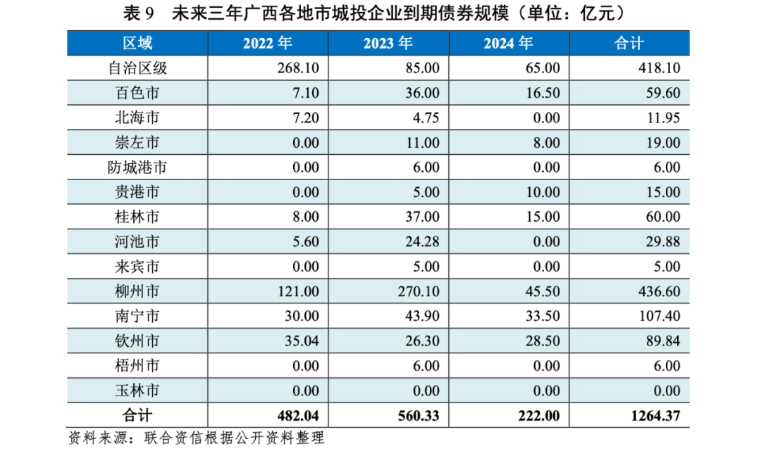 從廣西自治區(qū)級(jí)及各地市發(fā)債城投企業(yè)未來(lái)三年(2022-2024年)到期債券(包括回售行權(quán)部分)規(guī)模看,廣西未來(lái)三年到期債券規(guī)模分別為482.04億元、560.33億元和222.00億元,其中2022年和2023年存在較大集中償付壓力。