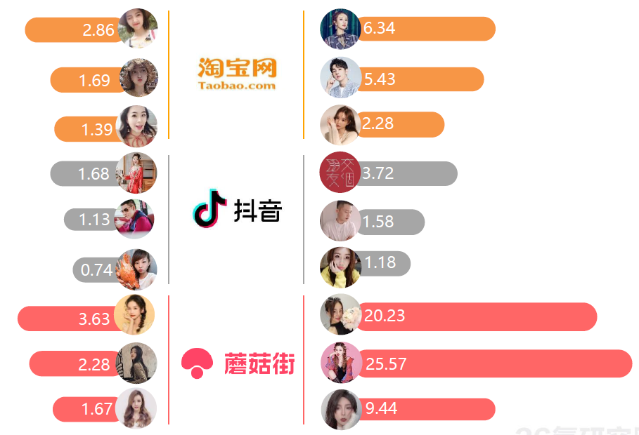 該圖展示了2021年11月11日期間各電商平臺中頭部及腰部主播的粉絲價值對比