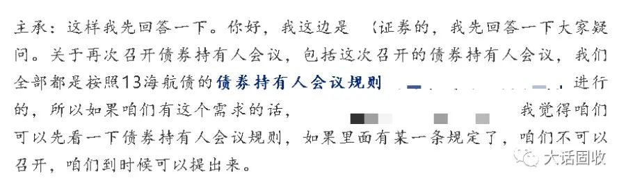 無獨有偶,昨晚海航的會議上,主承的發(fā)言也是強調(diào)“債券持有人會議完全是按照會議規(guī)則”來進行的。有質(zhì)疑的話,“先去看看這個會議規(guī)則”: