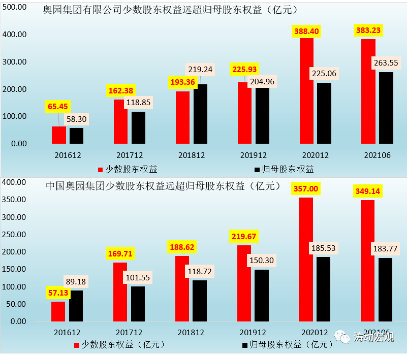 2、奧園系的收并購(gòu)方式實(shí)際上并非100%全資持有,而是以控股形式為主,即保留部分少數(shù)股東權(quán)益,且少數(shù)股東權(quán)益的比重越來(lái)越高。特別是對(duì)于一些城市更新、文旅等長(zhǎng)期開(kāi)發(fā)項(xiàng)目,奧園系通常會(huì)引入私募股權(quán)投資基金、信托等作為少數(shù)股東,來(lái)提供資金支持,而這部分資金常以明股實(shí)債的形式存在。