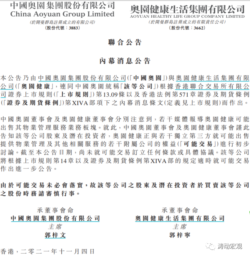 1、2021年11月3日,有媒體報(bào)道稱,為緩解流動(dòng)性壓力,中國(guó)奧園擬出售旗下物業(yè)公司奧園健康控股股權(quán),已接觸合生創(chuàng)展等多個(gè)買家,并希望11月底前能夠完成。2021年11月4日,中國(guó)奧園、奧園健康聯(lián)合發(fā)布公告稱“奧園健康正與若干獨(dú)立第三方就可能出售提供物業(yè)管理及其他相關(guān)服務(wù)的若干附屬公司的權(quán)益進(jìn)行初步討論,截至目前尚未就可能交易訂立任何條款或具體協(xié)議”。