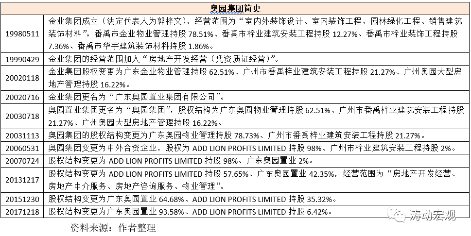 1、奧園集團(tuán)有限公司成立于1998年5月(法定代表人為郭梓寧、位于廣州市番禹區(qū)、廣東奧園置業(yè)持股93.58%、ADD LION PROFITS LIMITED持股6.42%),最終實(shí)控人為郭梓文。