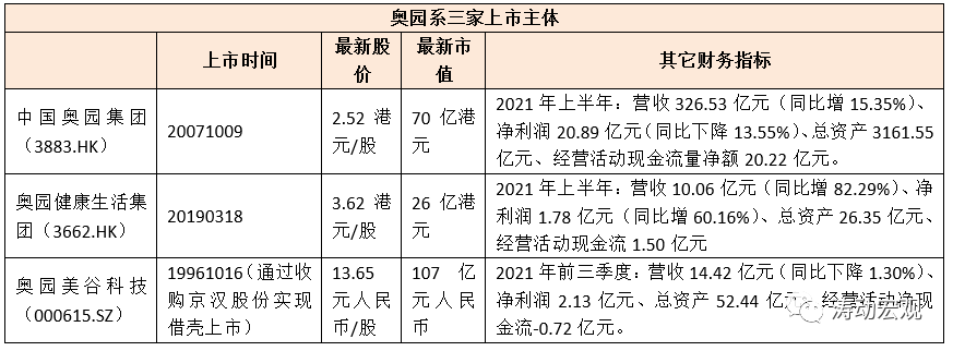 奧園系有三家上市公司,分別為中國(guó)奧園集團(tuán)(3883.HK)、奧園健康生活集團(tuán)(3662.HK)以及奧園美谷科技(000615.SZ),即兩家港股上市公司和1家A股上市公司。其中,奧園健康生活集團(tuán)和奧園美谷科技分別是奧園系內(nèi)的物業(yè)主體、綠纖和醫(yī)美主體,中國(guó)奧園和奧園美谷均注冊(cè)于開(kāi)曼群島。