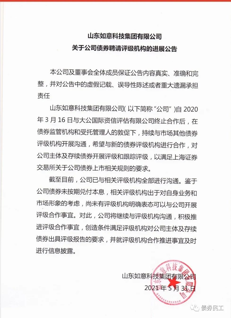 根據山東如意科技集團有限公司(以下簡稱“如意集團”)2021年5月31日的公告,自公司2020年3月16日終止與大公國際的評級合作之后,公司與評級機構全部溝通完畢,沒有評級公司與公司開展評級合作。這在信用債券市場上也是很少見的了,畢竟多數債券都需要披露跟蹤評級報告。