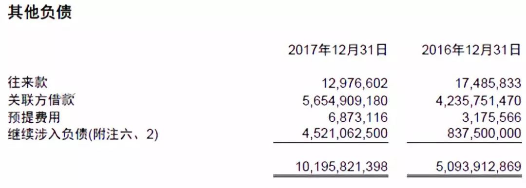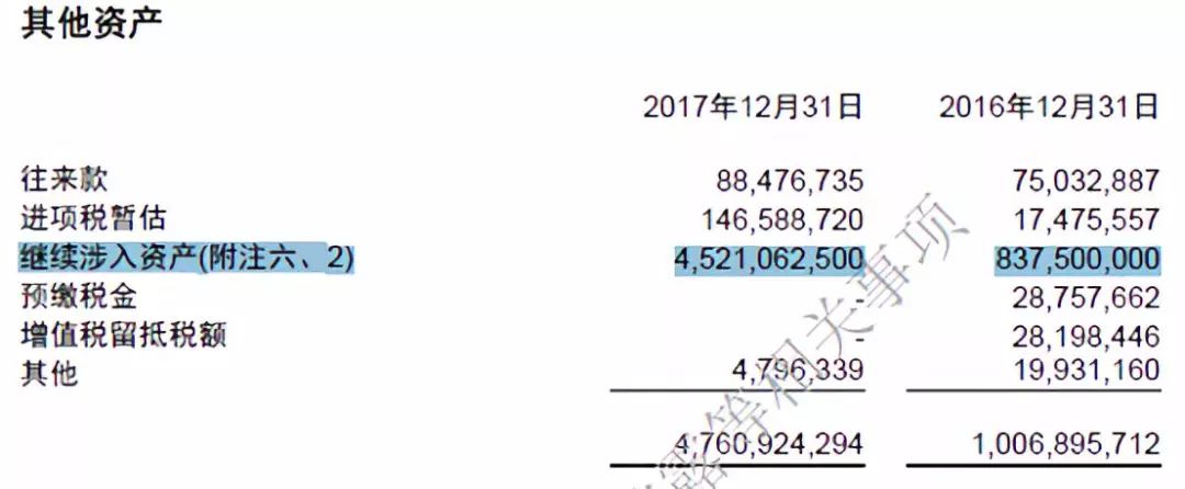 商誠小貸對繼續涉入資產和負債的表述如下:“截至2017年12月31日,本集團因繼續涉入確認的資產的賬面價值為人民幣4,521,062,500元(2016年12月31日:人民幣837,500,000元),與之相關的負債為人民幣4,521,062,500 元(2016 年12 月31 日:人民幣837,500,000元),分別計入繼續涉入資產和繼續涉入負債,該等負債金額表示本集團因持有次級檔計劃,收益分配處于次級而導致可能不能收回的最大現金流。”