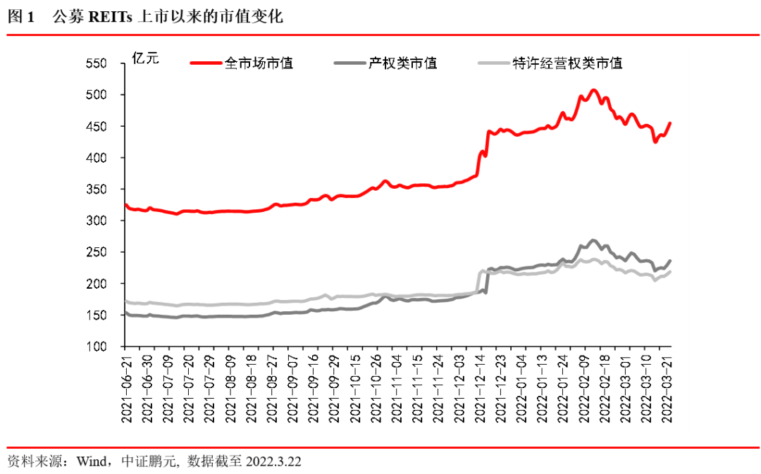 截至2022年3月22日,我國基礎(chǔ)設(shè)施公募REITs共發(fā)行11只,上市融資規(guī)模364億元,平均融資規(guī)模33億元;目前總市值455億元,平均市值41億元,全市場溢價率為25%。整體收益(未考慮分紅)表現(xiàn)最好的是富國首創(chuàng)水務(wù)REITs和建信中關(guān)村REITs,溢價率分別為70%和54%,平安廣州交投廣河高速公路REITs溢價率最低,僅為2%,唯一一只收益率為個位數(shù)的產(chǎn)品。基礎(chǔ)資產(chǎn)類型較為集中,其中產(chǎn)業(yè)園區(qū)REITs有4只、高速公路REITs有3只、倉儲物流和污染處理REITs均為2只。按照資產(chǎn)權(quán)屬劃分,產(chǎn)權(quán)類公募REITs有6只,資產(chǎn)類型有產(chǎn)業(yè)園區(qū)和倉儲物流;特許經(jīng)營權(quán)類公募REITs有5只,資產(chǎn)類型有高速公路和污染處理。目前申報(bào)在審核的REITs有2只(國泰君安臨港東久智能制造產(chǎn)業(yè)園和鵬華深圳能源清潔能源),已經(jīng)通過審核待上市的1只(華夏中國交建高速公路)。