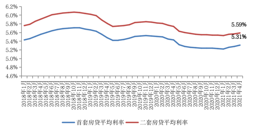 圖:2018年1月-2021年4月全國首套、二套房貸平均利率