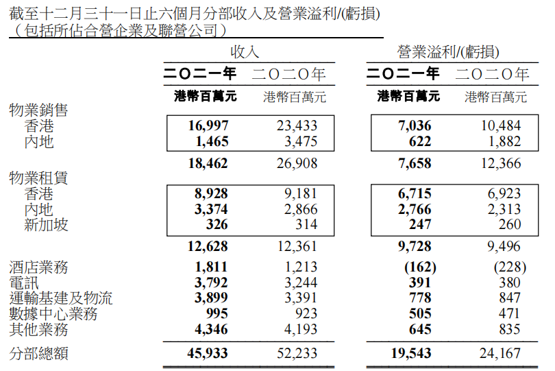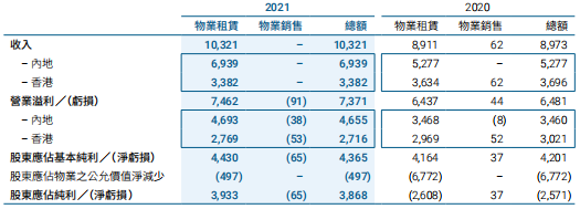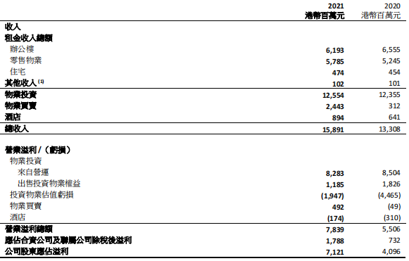 截至2021年12月31日止六個月,該集團實現營業收入401.53億港元,比下降12.84%。總租金收入包括所占合營企業和聯營公司的租金收入按年上升2%至港幣126.28億元,凈租金收入按年上升2%至港幣97.28億元。