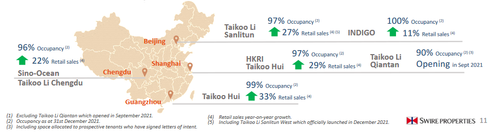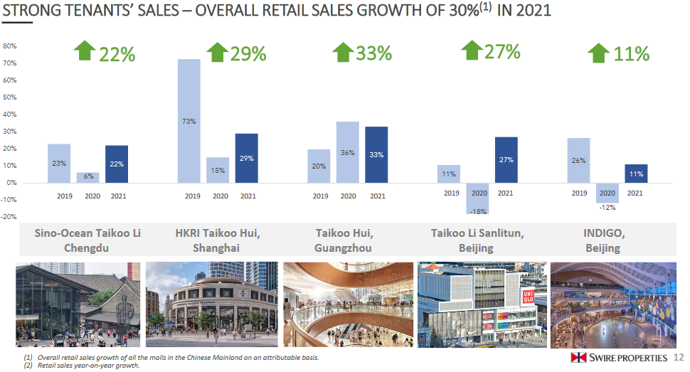 收入增長3%,租戶銷售額上升20%,未來商場將進一步加強其定位,并引入更多元化的奢侈品牌。由于本地市場對奢侈品的需求強勁,加上翻新工程于非營業時間分階段進行,將租戶所受的影響降至最低,因此,租戶銷售額上升20%。經過翻新的區域將于2022年中起分階段重開;