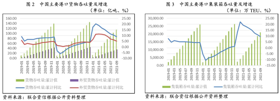 受新冠肺炎疫情沖擊影響,2020年中國(guó)港口吞吐量增速明顯下降;2021年前三季度貨物吞吐量增速基本已回歸至2019年水平,集裝箱吞吐量增速受益于出口形勢(shì)較好顯著高于2019年水平;不同港口吞吐量增速受腹地經(jīng)濟(jì)及貨種結(jié)構(gòu)影響存在分化,個(gè)別港口吞吐量降幅較大。