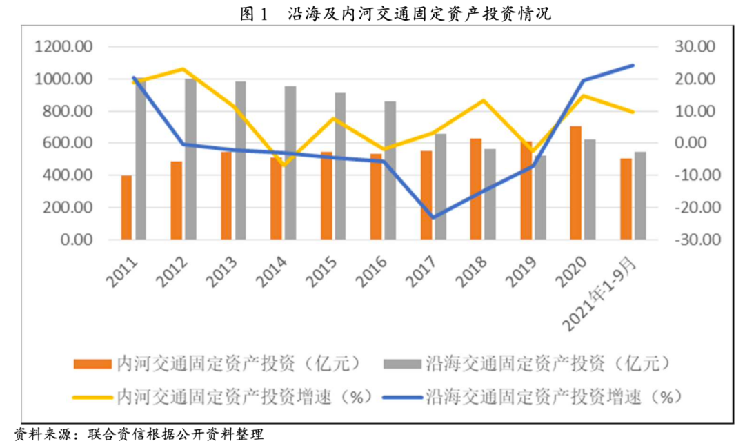 中國(guó)沿海港口處于結(jié)構(gòu)性產(chǎn)能過(guò)剩階段,沿海港口整體投資規(guī)模呈下降趨勢(shì);受益于內(nèi)河航運(yùn)的發(fā)展,內(nèi)河港口投資規(guī)模呈上升趨勢(shì)。為應(yīng)對(duì)疫情對(duì)宏觀經(jīng)濟(jì)的沖擊,2020年以來(lái),水路固定資產(chǎn)投資增速大幅回升。