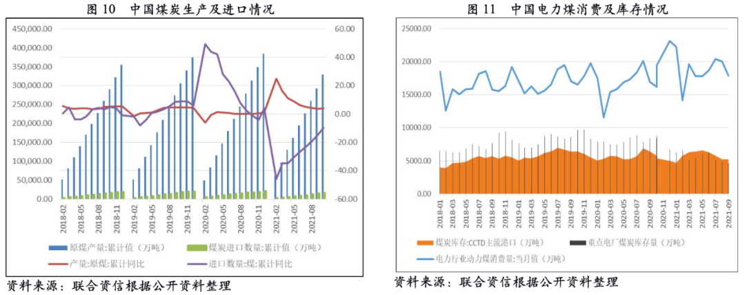 煤炭行業(yè)的下游需求主要集中在電力(約占54%)、鋼鐵(約占18%)和建材行業(yè)(約占10%)。2021年我國(guó)制造業(yè)及出口景氣度較高,對(duì)電力的消耗處于高位,2021年1—9月,全國(guó)火力發(fā)電量4.33萬(wàn)億千瓦時(shí),同比增長(zhǎng)12.94%,帶動(dòng)電力行業(yè)動(dòng)力煤消耗量維持在相對(duì)較高水平。2021年1—10月,全國(guó)原煤產(chǎn)量32.97億噸,同比增長(zhǎng)4.00%;同期,全國(guó)煤炭進(jìn)口量1.61億噸,同比下降9.82%,主要受中澳關(guān)系緊張減少進(jìn)口所致。受煤炭需求旺盛影響,CCTD主流港口煤炭庫(kù)存及重點(diǎn)電廠煤炭庫(kù)存目前均處于低位,存在較大補(bǔ)庫(kù)需求。此外,2019年9月28日,連接內(nèi)蒙古浩勒?qǐng)?bào)吉與江西吉安的浩吉鐵路全線通車運(yùn)營(yíng),浩吉鐵路年規(guī)劃煤炭運(yùn)力為2億噸,是中國(guó)“北煤南運(yùn)”戰(zhàn)略運(yùn)輸通道,其開(kāi)通對(duì)煤炭海運(yùn)及港口煤炭吞吐量造成較大分流。