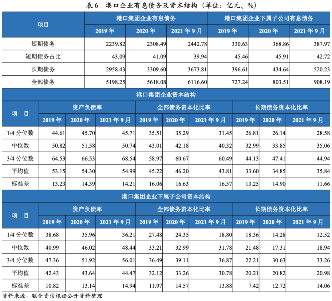 值得關(guān)注的是,港口集團(tuán)企業(yè)負(fù)債水平分化較為明顯,處于后1/4分位的港口集團(tuán)企業(yè)負(fù)債水平明顯偏高,其中6家企業(yè)2021年9月底的全部債務(wù)資本化比率超過(guò)60%。