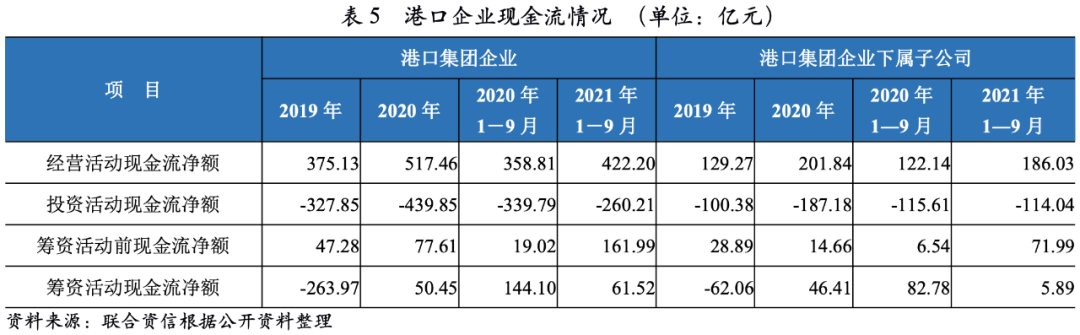 2021年前三季度,港口集團(tuán)企業(yè)經(jīng)營(yíng)活動(dòng)現(xiàn)金流量?jī)纛~同比增長(zhǎng)17.67%;投資活動(dòng)現(xiàn)金凈流出同比下降34.31%;籌資活動(dòng)前現(xiàn)金流凈額為161.99億元,籌資活動(dòng)現(xiàn)金凈流入61.52億元,融資需求及籌資力度較2020年均有所減弱。2021年前三季度,港口企業(yè)下屬(股份)子公司經(jīng)營(yíng)活動(dòng)現(xiàn)金凈流入同比增長(zhǎng)52.31%;投資活動(dòng)現(xiàn)金凈流出與去年同期基本持平;籌資活動(dòng)前現(xiàn)金流凈額為71.99億元,籌資活動(dòng)現(xiàn)金凈流入5.89億元,融資需求及籌資力度較2020年均明顯減弱。